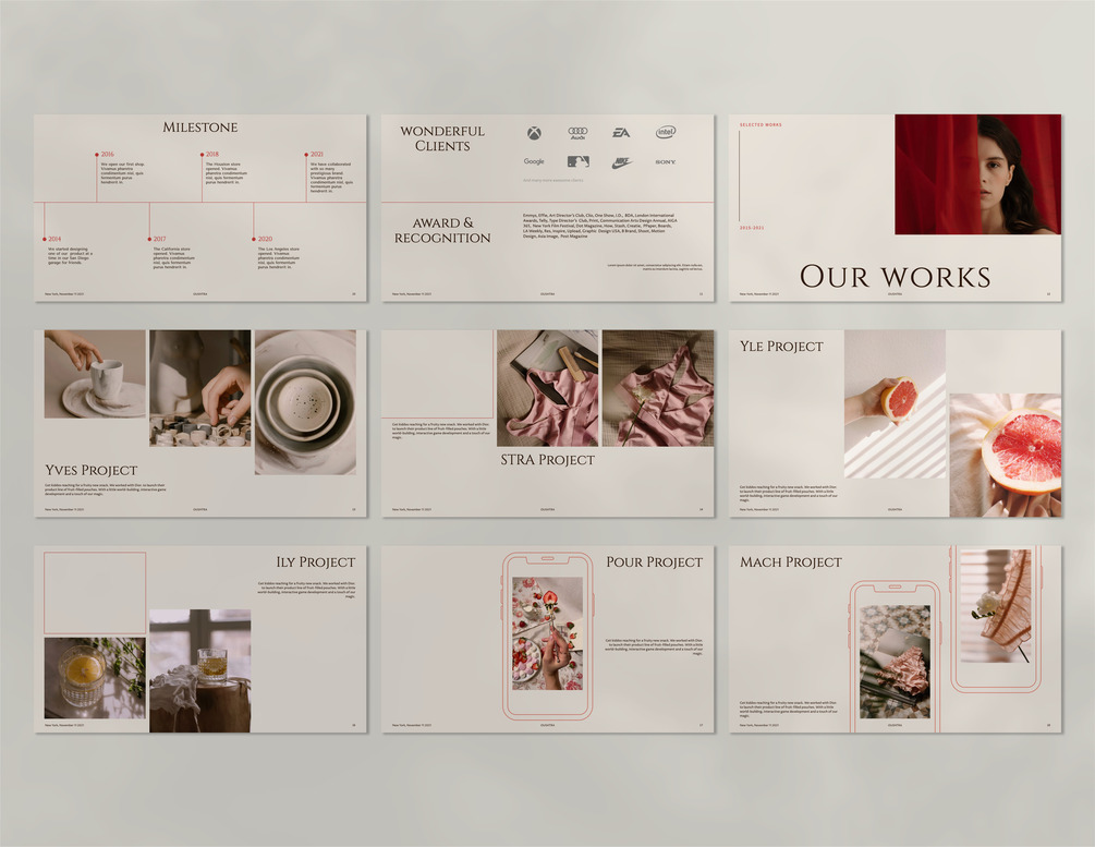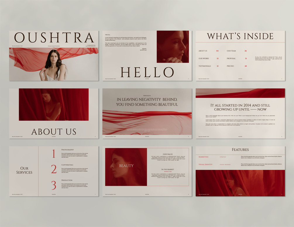 Oushtra Presentation Template is a minimalist elegant style presentation template with 50 fully editable slides.